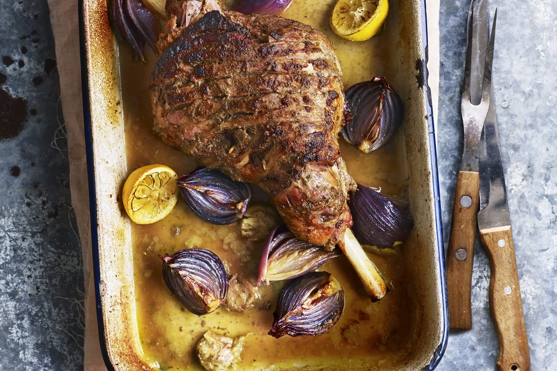 Încinge cuptorul la 220C/ventilator 200C. Pune ceapa roșie, usturoiul rămas și jumătate de lămâie într-o tavă și pune mielul deasupra. Se prăjește timp de 30 de minute. Scoateți mielul din cuptor, ungeți cu sucul din tigaie și turnați vinul în fundul formei. Coborâți cuptorul la 200C/ventilator 180C. Se mai coace încă 30 de minute. Se pune mielul pe o farfurie, se unge din nou cu vinul unt, se acopera si se odihneste 30 de minute. Transferați mielul pe o placă și tăiați. Serviți cu sucuri din tigaie, cartofi fripți și legume, dacă doriți.