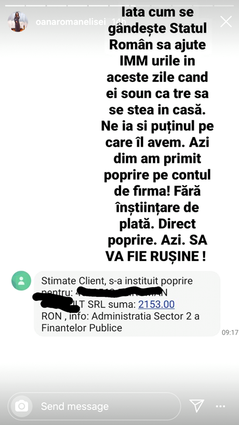 „Iată cum se gândește statul român să ajute IMM-urile (n.r. – Întreprinderi Micro, Mici şi Mijlocii) în aceste zile când ei spun că trebuie să se stea în casă. Ne ia și puținul pe care îl avem. Azi dimineață am primit poprire pe contul de firmă! Fără înștiințare de plată. Direct poprire. Azi. SĂ VĂ FIE RUȘINE!”, a spus Oana Roman, citată de wowbiz.ro.